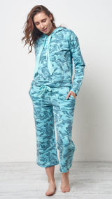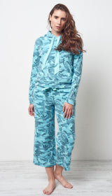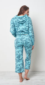 Wide leg cropped mid-rise pant with side pockets and contrast fabric pulls