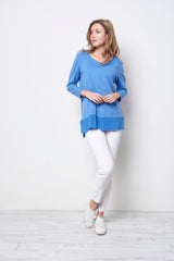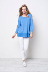 Three quarter length sleeve knit top with rolled edge detailing at the neckline and high-low contrast hem with slit detailing.